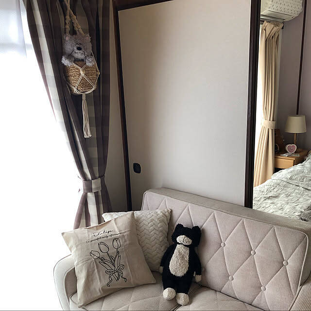 セリアのクッションカバー2種類をソファに置かれている、Naoさん。ソファと同系色のクッションは、落ち着いた雰囲気を演出しています。線画のみのチューリップ柄はシックで、春らしさもありながら季節を選ばず使いやすいデザインです。