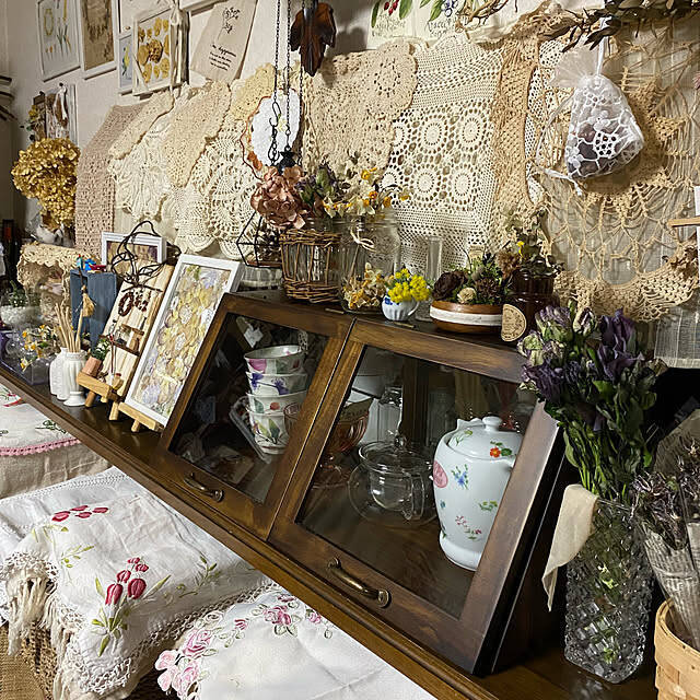 ChiCoさんは、カウンター上にガラスケースを置いて、本格的なカフェの趣を演出しています。カウンターと色味を合わせたダークブラウンが、アンティーク風のどこか懐かしい空間を作り出します。普段使いの食器も、ガラス越しに見えるだけで特別な存在に。ブレイクタイムがより一層待ち遠しくなりますね。