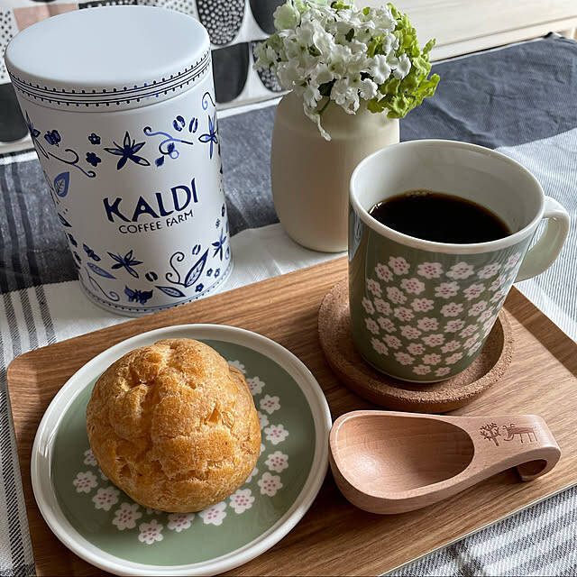 youmitsuさんが楽しむのは、春季限定「スプリングブレンド」のセットです。上品なキャニスター缶と木製スプーンが、マリメッコの食器と調和し、北欧カフェのような雰囲気を演出しています。カルディのコーヒーは種類豊富なため、お気に入りの味や香りがきっと見つかりますよ。