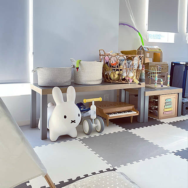 IKEAのKALLAXは、扉付きの部分で生活感を隠しつつ、オープンな部分にはお気に入りのおもちゃをディスプレイのように並べて楽しむことができます。ユーザーさんも、ぬいぐるみや絵本は見せる収納にして使い分けていますね。やわらかなホワイトで圧迫感を感じず、ナチュラルなお部屋の雰囲気にぴったりです。