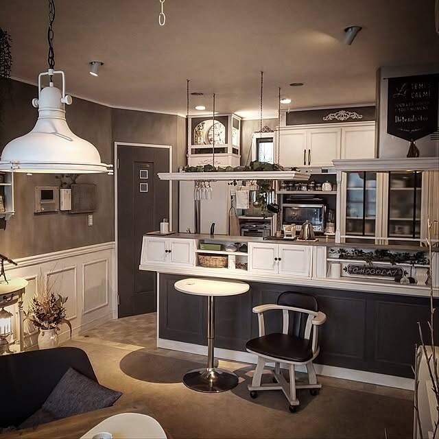 お家全体をDIYで海外風に仕上げているchorontさん。リビングからつながるキッチンまわりの腰壁にはモールディングをほどこし、ヨーロピアンな雰囲気を演出していました。濃淡の異なるグレーとホワイトを組み合わせた、シャビーシックなカラーコーディネートも素敵ですね。