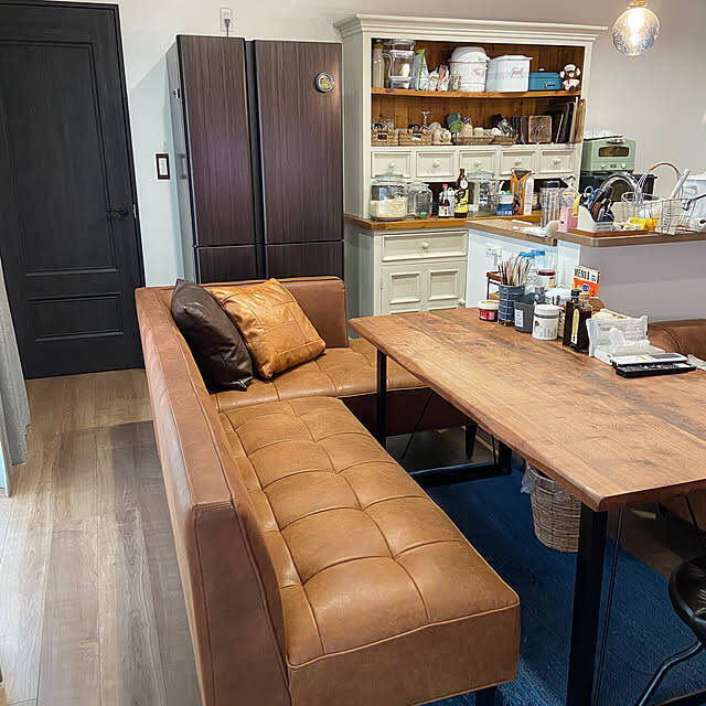 ダイニングソファをリビングにお迎えしたemabokさん。ブラウンレザーのヴィンテージ風ソファと木目のテーブルが、落ち着いた空間を演出しています。同じ色味の組み合わせが空間に広がりを与えてくれますね。L字型のソファは自然と家族が向き合う形になるため、会話も一層弾みそうです。