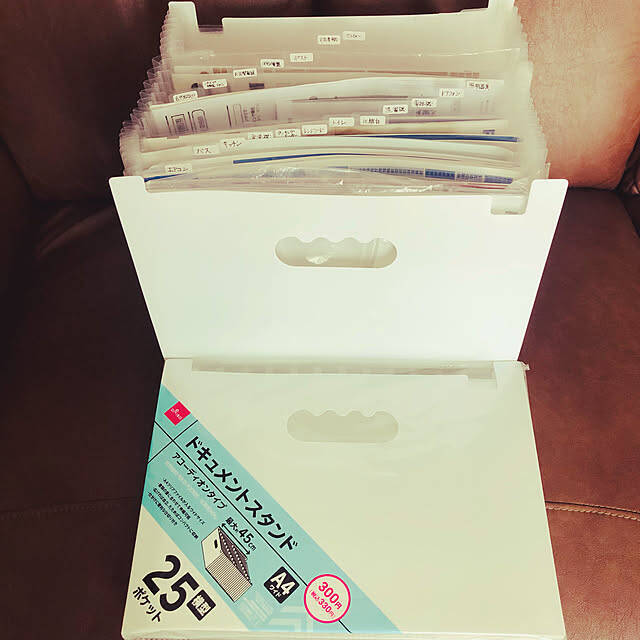 ダイソー「ドキュメントスタンド」は、蛇腹式で25ポケット入るファイルボックスです。広げると自立するので、そのまま収納できて便利ですね。ユーザーさんは、説明書などの書類整理に使用されています。インデックスにラベリングされていて、分かりやすいですね。