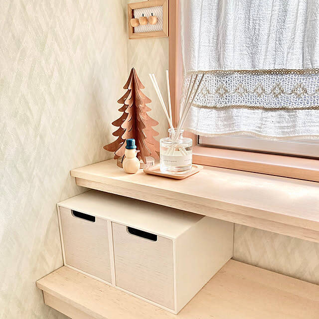 merutoさんは、トイレのサニタリー収納にニトリの引き出しを使っています。ワンアクションで取り出せて、ストックもガバッと補充できるので使いやすくてオススメとのこと。明るい色合いの木目調が、DIYで作ったという棚にそろっていてピッタリですね。