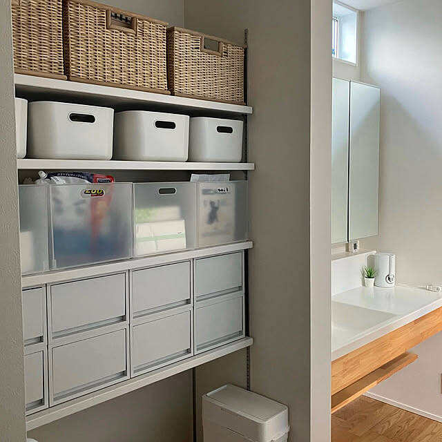h___m.z.kさんは、洗面所の棚の下段で「小物収納ケース 大」を活用しています。実例のように2段スタッキングして並べておくと、スッキリ見えて良いですね。こちらのコーナーには掃除道具やストック類を収納されているとのことです。