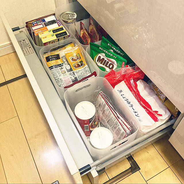 Kさんは、キッチンの引き出し収納に食材を収納しています。ダイソーのケースを使い、場所を区切ることによって、在庫の管理がしやすいそうですよ♪ここに入る分だけストックすると決めることで、買いすぎを防止することもできますね。