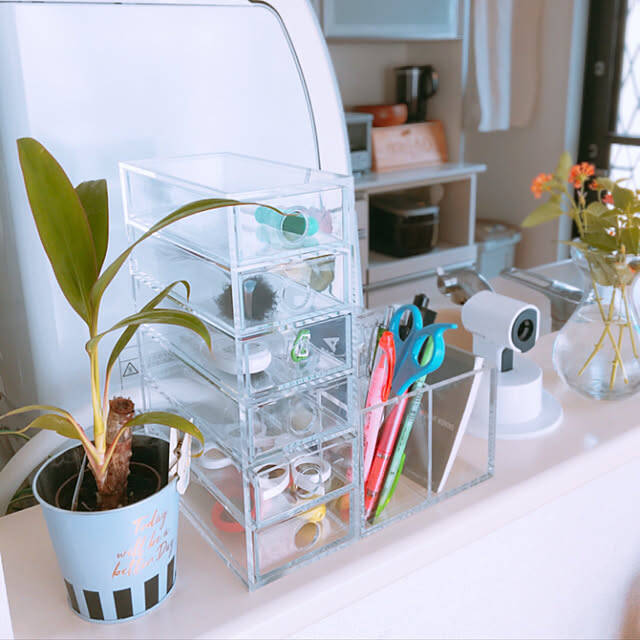 カウンターまわりでよく使う小物を、引き出しタイプやペン立てタイプのアクリル収納で見せる収納にしている実例です。Kaimama224さんは、ワンアイテムづつ納めることで見ためをすっきり整え、何がどこにあるかひと目でわかるよう工夫しています。 家族がサッと元に戻せるのもうれしいポイントですね。