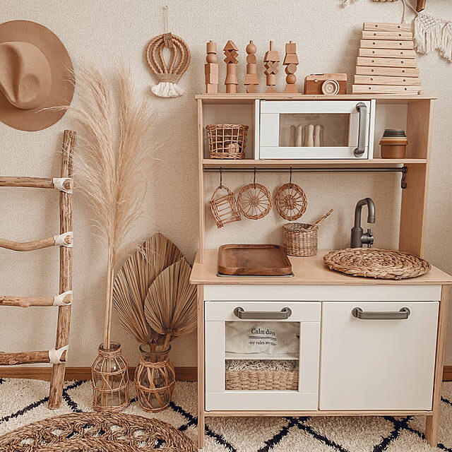 テレビ横のオープン収納にぴったり収まっているおままごとキッチン♪娘がお気に入りのおもちゃを飾ったりシールを貼ったりでごちゃごちゃですが、楽しんで使っています♡