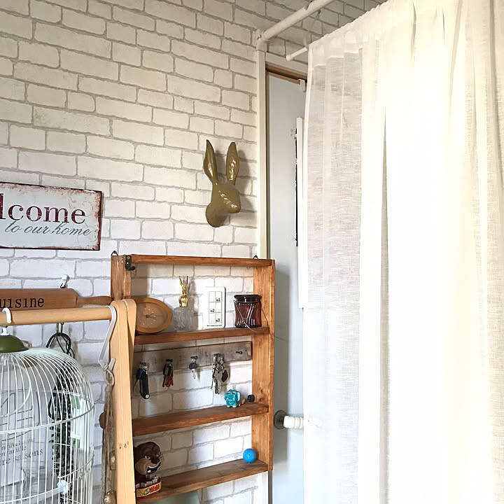hirariさん「外の暑さ、室内の冷気がなるべく早く入り混じらないように、3COINSのカーテン3枚を並べてます。端材を使った飾り棚は、家族みんなの鍵置き場として使ってます。」