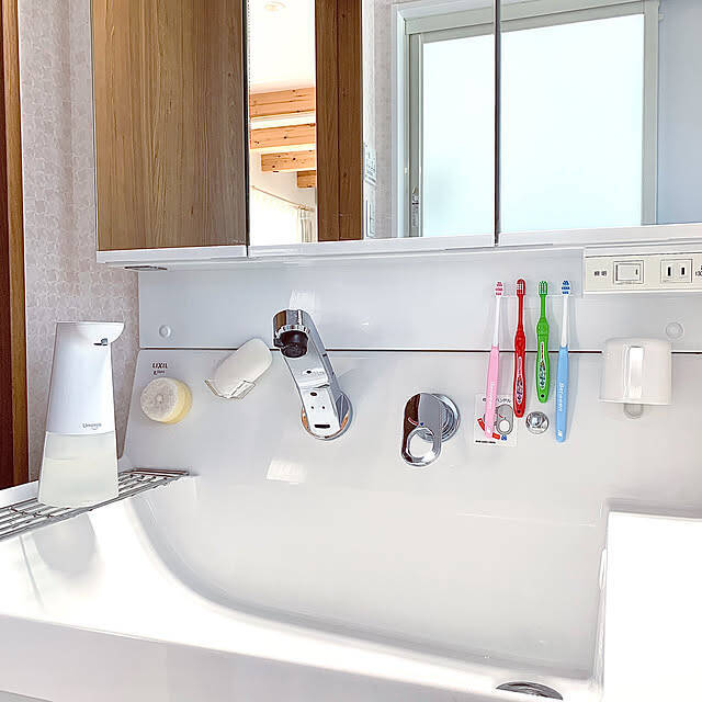 koko_hikaさんが使われている石けんホルダー、歯ブラシホルダー、コップホルダーは、セリアで人気の貼ってはがせるシリーズです。洗面台に置く小物類は、このように浮かせて収納できると水が溜まらず衛生的ですね。見た目もすっきりで、清潔感のある気持ちのいい空間になっています。