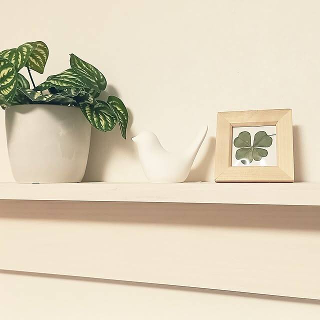 お子さんが四つ葉のクローバーをくれたという、osakanaさん。押し花にして、セリアのナチュラルなフォトフレームに入れて飾られています。正方形のシンプルなフォトフレームに、クローバーがぴったりとはまっていますね。心があたたかくなるインテリアです。