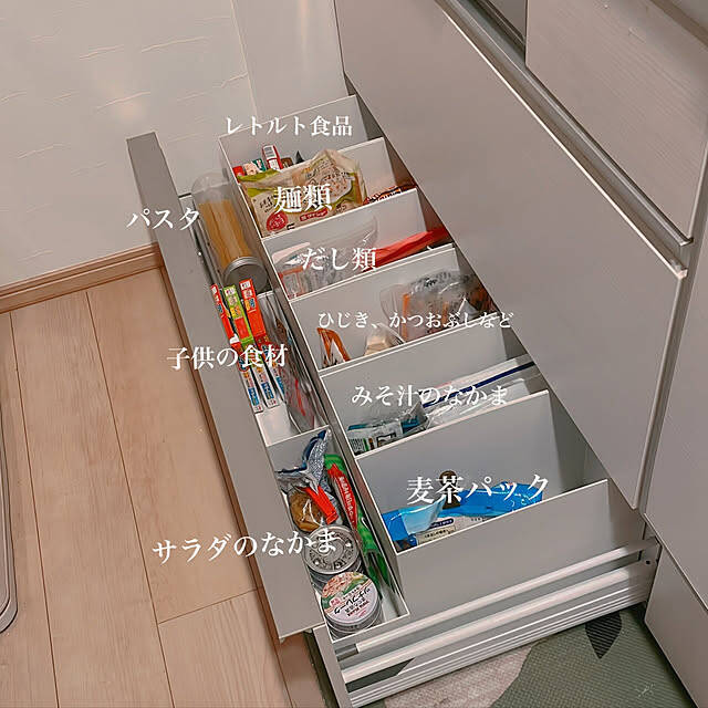 食糧庫が大きいほど管理が難しくなると感じたgonchanさんは、食品のストックをこちらの引き出しに限定して収納していました。中にはファイルボックスを並べ、種類ごとにわかりやすく仕分け。詰め込みすぎないことで中身が一目で確認でき、無駄買いや食品ロスの防止にもつながっているそうです。