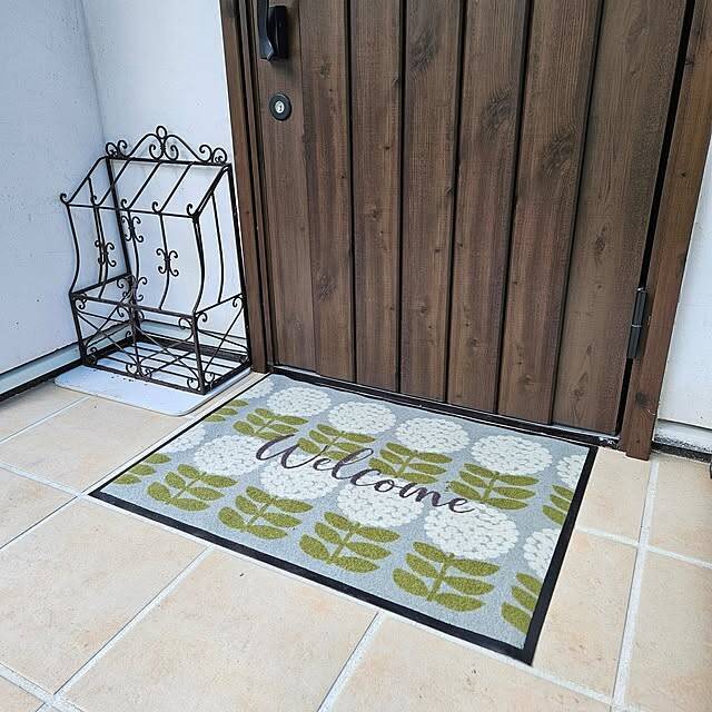 北欧フラワー柄の玄関マットがやさしく迎えてくれるmayumiさんの玄関。木目のドアやアンティーク風の傘立てとも相性がよく、帰るたびにほっとする空間になっていますね。デザイン性だけでなく、靴裏の汚れをしっかり落としてくれる実用性も魅力です。玄関の第一印象を決める大切なアイテムですね!