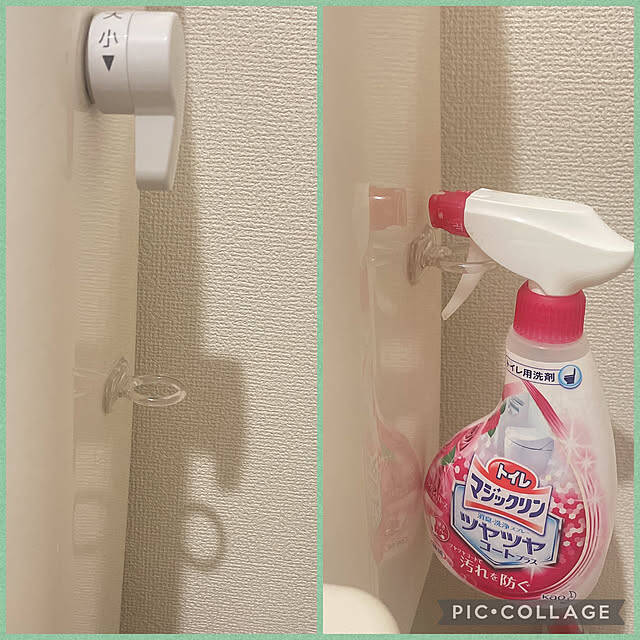 こちらは、「何度でも貼ってはがせるフイルムフックリング」です。繰り返して使えるうえ、透明で目立ちにくいのも特徴のフックです。akiko-ovさんはトイレのタンクの横に貼り付けて、掃除用スプレーの置き場所として活用していました。リングタイプは、このように引っ掛けて収納できるというのも便利そうです。