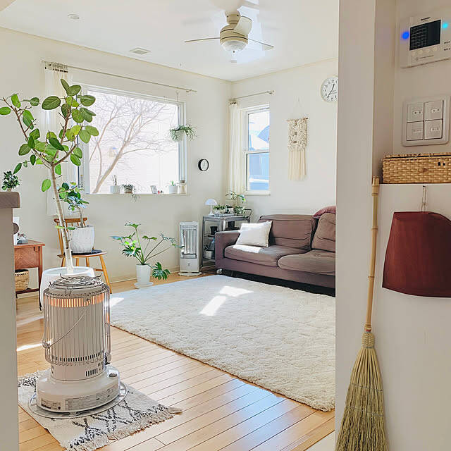 aripiさんが使っているのは、ニトリの「やわらかシャギーラグ」です。やや長めの毛足で、手が埋もれるほどのボリューム感を楽しめる一枚。ふかふかの質感が写真からも伝わってきますね。淡いグレーのラグは、海外風のシンプルインテリアと相性抜群。円形タイプを選ぶと、ソフトな雰囲気を演出できます。