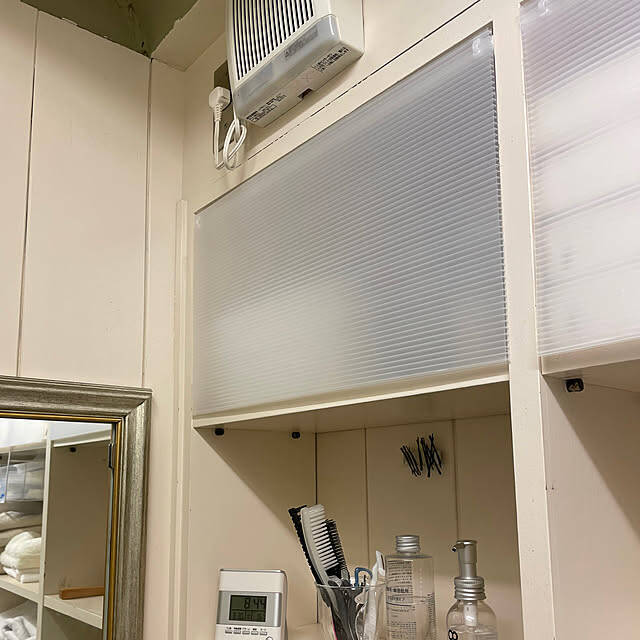ka10935さん宅では、オープンラックの埃よけとしてプラダンで作った扉を付けています。プラダンに結束バンドを通して、それを突っ張り棒に括り付けてパタパタと開け閉めができるように工夫。衛生的にものをしまっておけるうえ、程よく中身を隠してくれるので、タオル類や日用品などの収納にも良さそうです。