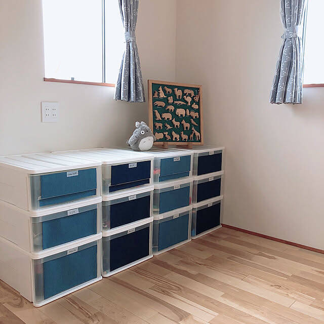 kossyさんは衣装ケースにダイソーの貼れる布を使い、中身のおもちゃを目隠ししています。青色が好きなお子さんのためにデニム生地を選んだそうですよ。濃淡2種類の青がお部屋のアクセントになりますね。デニムを貼ったクリアファイルを引き出し前面に両面テープで固定しています。