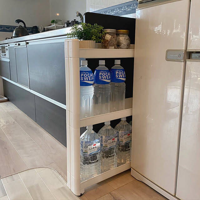 まずは、ワゴンにペットボトルを収納しているユーザーさんをご紹介します。キャスターのおかげで、重たいペットボトルもストレスなく移動できるのが魅力。サイズやデザインもさまざまなワゴンが登場するので、ぜひ理想のものを見つけてみてくださいね。