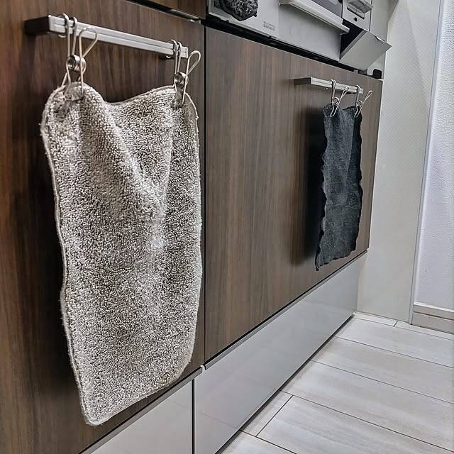 mi-saさんは、引き出しの取っ手に100均で購入したハンギングステンレスピンチを掛け、ふきんの一時置き場として活用していました。短めのサイズで目立ちにくい点が選んだ決め手になったそう。ピンチを2つ使ってふきんを広げた状態でかければ、より乾きやすさもUPします。