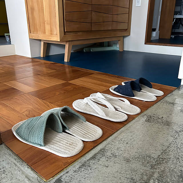 miri_bukkoさんが愛用されているのは、無印良品のルームサンダルです。前あきタイプが色違いで2足、鼻緒タイプが1足、玄関に並んでいます。組み紐を縫い合わせたデザインで、履き心地が良いそうです。ナチュラルな風合いに惹かれます。