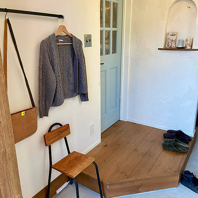 元々はドアの取っ手だったというバーを壁面に取り付けて、上着やバッグなどをかけているSuzuki.Pandaさんの実例です。まるで雑貨屋さんのような雰囲気で、見ているだけで楽しくなりますね。上着やバッグはかけすぎないようにすると、生活感も軽減できます。