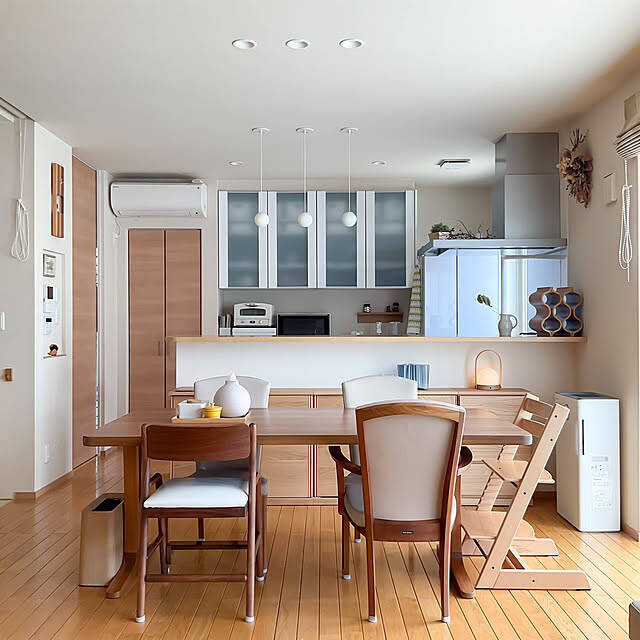 tokonekoさんは、ナチュラルカラーのトリップトラップをお使いです。他メーカーのダイニングテーブルやチェアとも相性がよく、統一感のあるダイニングになっていますね!木の温もりが感じられる空間です。