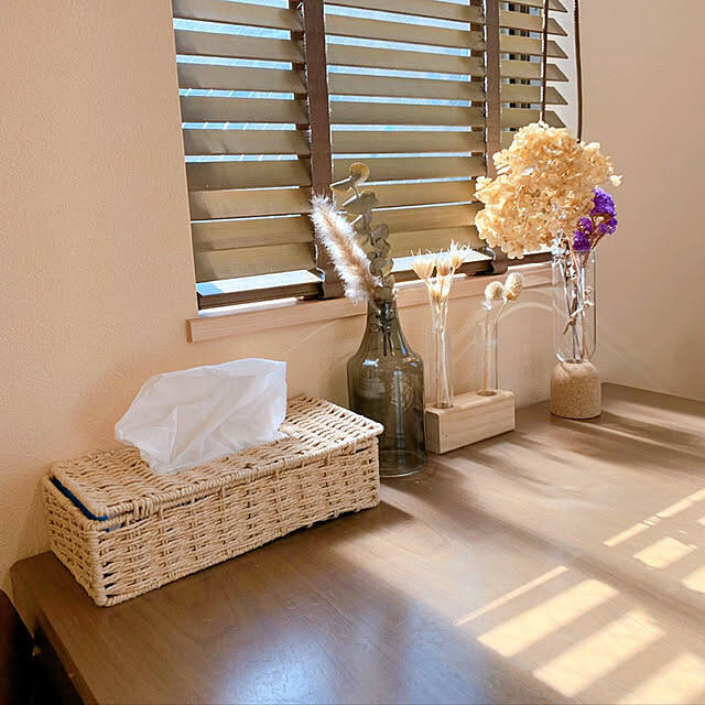 ユーザーさんは、B-COMPANYのティッシュケースを使用しています。生活感の出やすいティッシュをやさしい編み目のケースに入れることで、全体の雰囲気がまとまってみえますね。やわらかなホワイトが木目のテーブルやブラインドとよくなじみ、ナチュラルな温もりが感じられる空間です。