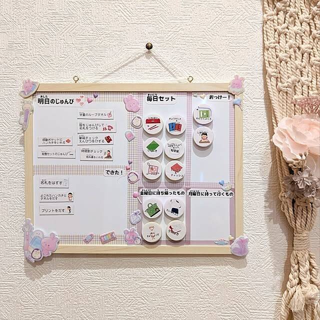 お支度ボード小学生ver.作りました!おしたく⋯というか学校の準備ボードかな?一年生女子が好きそうな感じにしてみました。マグネットホワイトボードやシールなど全てセリアで購入したものでできました!学校から帰宅後すぐに明日の準備をしますが「次なにやったらいい?」「つぎは?」……と毎日この繰り返しなので、このボードを見ながら自分でできることを増やしていってほしいです!