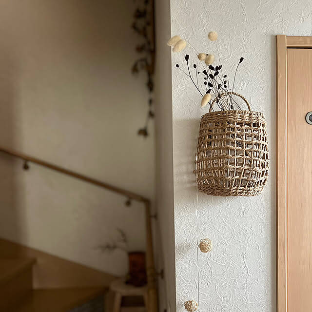 THREEPPY♡手編みペーパー壁掛けバスケット♪ワレモコウとバニーテールのドライを入れて一階トイレ横の壁に……ラタンボールライトもぶら下げてみました!