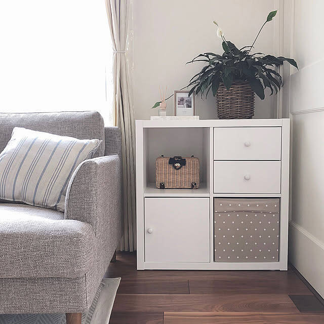 大人中心の生活になると、インテリアを楽しむ余裕も出てきます。ri4さんはバスケットのインサートを組み合わせて、お気に入りの雑貨を飾るディスプレイ収納として活用されています。ナチュラルな天然素材の雰囲気が、暮らしに優しい彩りを添えていますね。