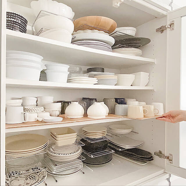 Naoさんは、食器棚収納にニトリの「滑りにくい木製トレー」を取り入れています。細々とした物を乗せていて、引き出して奥からも取り出しやすいとのこと。上段と下段で使っているニトリのディッシュラックも、大きい皿でもはみ出し気味で収納できて◎だそうです。