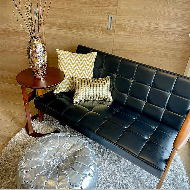ユーザーさんが愛用しているのは、カリモク60のKチェアです。上質なブラックレザーの質感でほどよい重厚感がありながらも木製アームの温もりが全体のバランスをやわらげ、空間に落ち着きをもたらしてくれます。明るい色合いのクッションや、艶やかなフラワーベースとの組み合わせもいいですね。