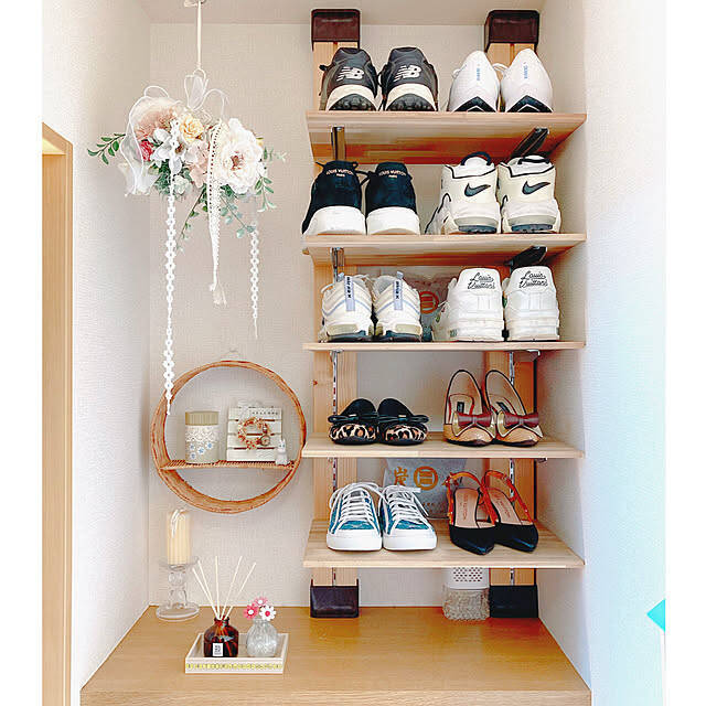 yuyuさんは、下駄箱の上にシューズラックをDIYしました。ディアウォールを使っているので壁に傷が付かず、賃貸でも安心です。柱に可動棚用のレールを取り付けており、靴に合わせて高さを変えられるのが魅力。お気に入りの靴をズラリと並べて、ショップのようなインテリアを楽しめますね。