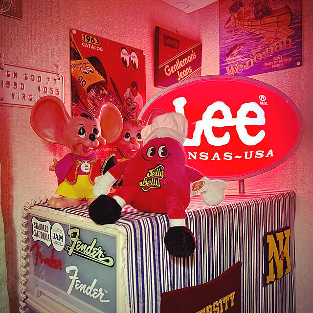 お部屋の一角にアメリカン雑貨をディスプレイされている、tomson330さん。Leeのストアディスプレイライトやフロリダマウスのコインバンク、ミスタージェリーベリーのぬいぐるみなどが並んでいます。鮮やかなアイテムが目を引きますね!