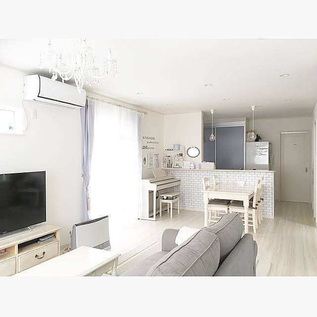 こちらの実例では、キッチンカウンターの正面にダイニングを配し、その向こうにリビングを作っています。ピアノやテーブル、ソファなど長方形の家具がどれも同じ方向に並んでいるので、整った印象に仕上がりますね。色もホワイトでそろえられていて、開放感が伝わってきます。