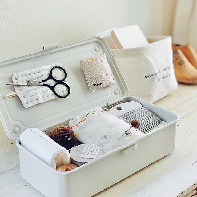まずご紹介するのは、工具箱を裁縫箱として活用している実例です。蓋もきちんと閉まる工具箱は、針やハサミなど危ないものを入れても安心なのがうれしいところ。しっかりした作りなのも魅力です。