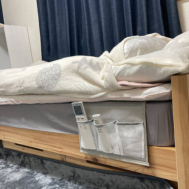 koroさんは、ポケットが3つついた、差し込み式収納ポケットを取り入れていました。マットレスと布団の間に挟んで、ミニマルな収納場所として大活躍していましたよ。このように、リモコンなどを入れておけば、すぐに手に取れて、寝ながらでも使うことができますよね。かさばらない収納スペース作りにぴったりです。