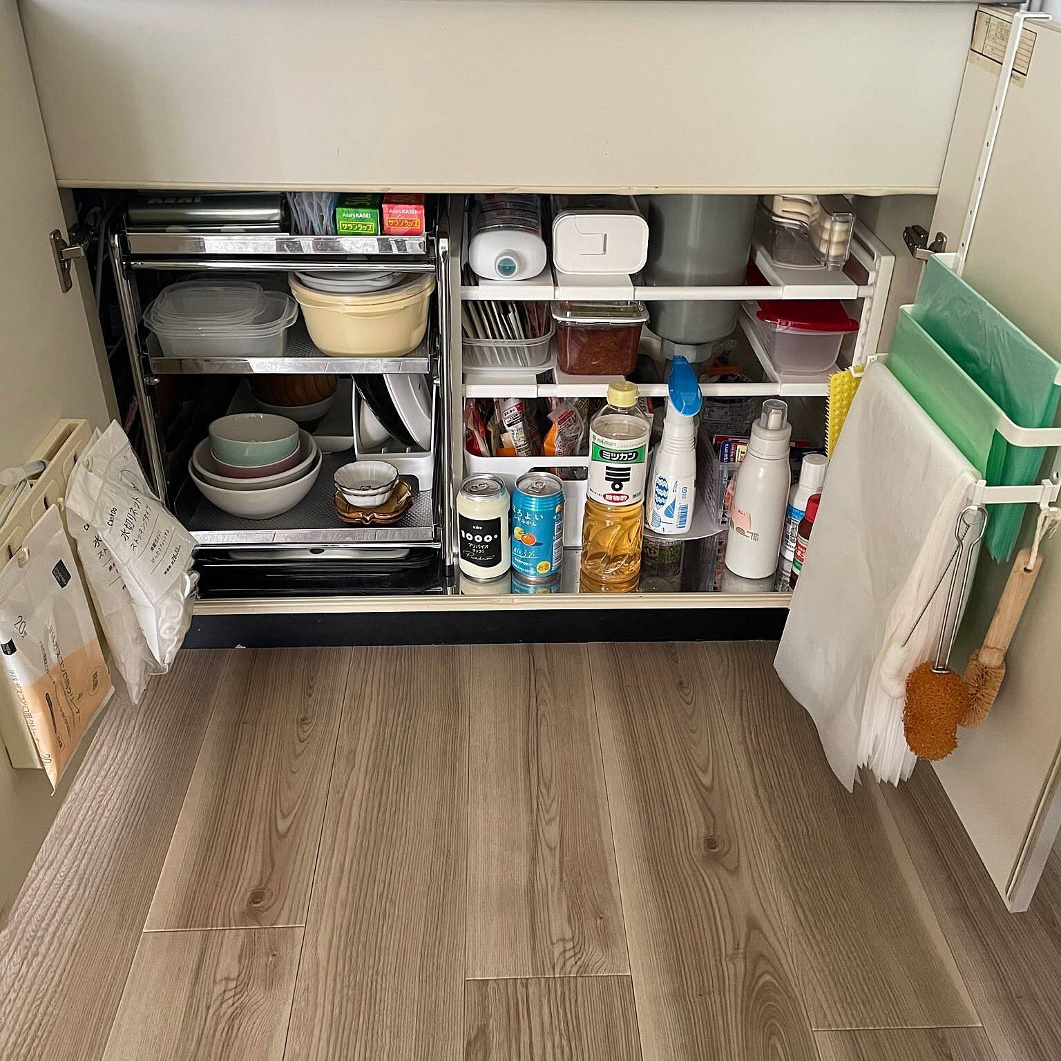 シンク下と一口に言っても、そのサイズはまちまちです。ひとつのキッチンの中でも、写真のように横幅はバラバラ……。hitomiさんの愛用品は、そんな気難しいシンク下に対応すべく、横幅違いの展開が用意されているのも魅力です。場所ごとに使い分けたり、収納したい物に合ったサイズを並べたり、シンク下のカスタマイズを叶えてくれます。『シンク下が片付かない、上手く使えない』とお悩みの方はぜひ、参考にしてみてください。※横幅により価格が上下します。