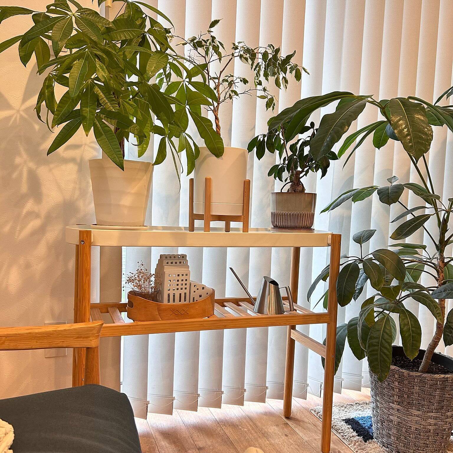 「日当たりを考えると必然的に窓際に植物が集まるので、その辺りがごちゃついてしまいがちです。でも、こちらのおかげで小さな植物の目線を高くできるので、すっきりとまとめることができます。また、スタンド自体に抜け感がある造りのため、自然と立体感が出て空間に変化を付けられるのも嬉しいところ。床も広く見せられます。」