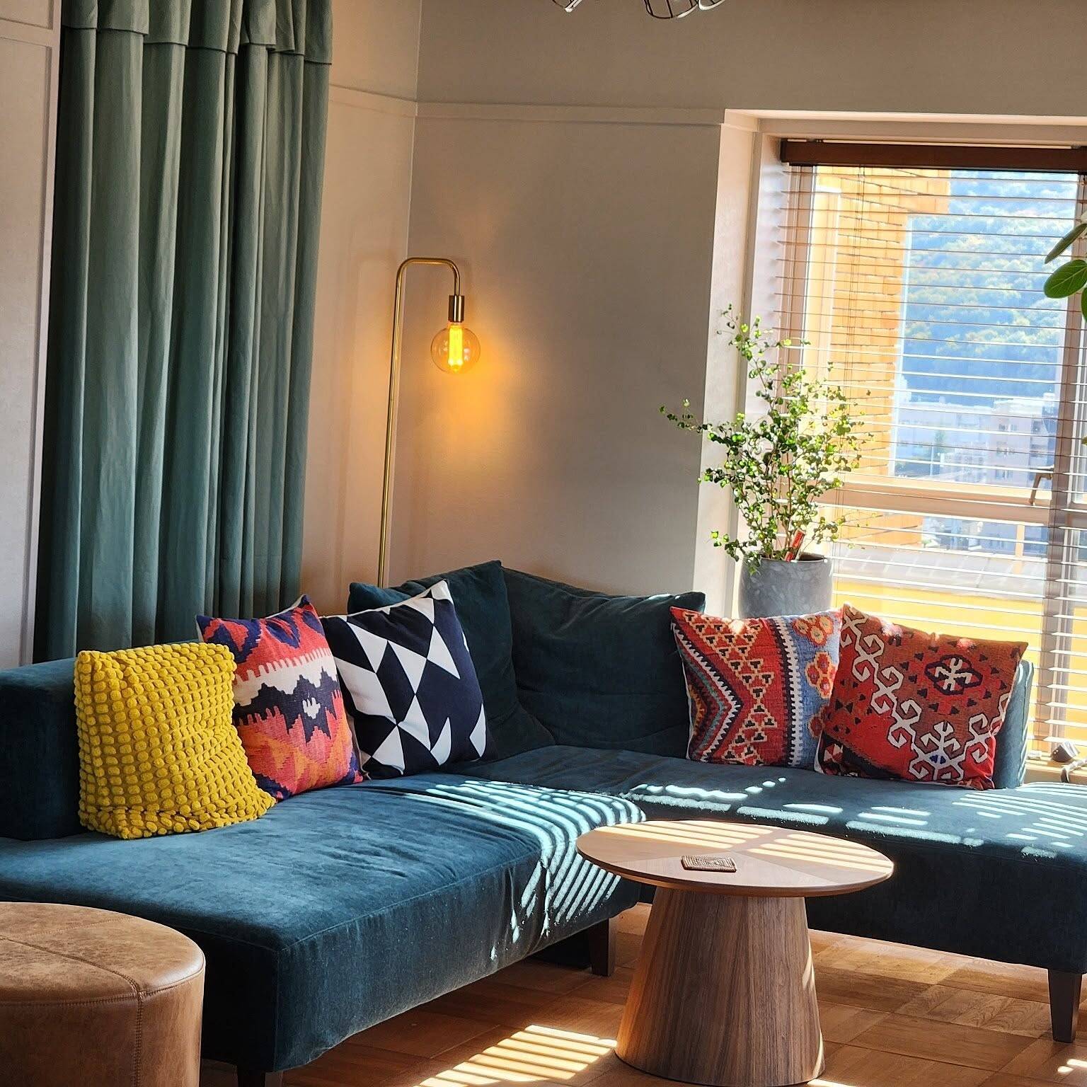 シンプルなインテリアに変化を付けたい、アクセントを加えたいと考える方にも、今回ご紹介いただいたmoo56co6さんの愛用品はうってつけです。もちろん、アジアンな雰囲気が好きな方やカラフルなコーディネートが好きな方にも◎。伺ったお話しからもわかるように、キリム柄は不思議なくらい臨機応変に『今あるもの』に馴染む力を備えています。4つセットなので、レイアウトや組み合わせの幅もかなり広めです。ぜひ、参考にしてみてください。
