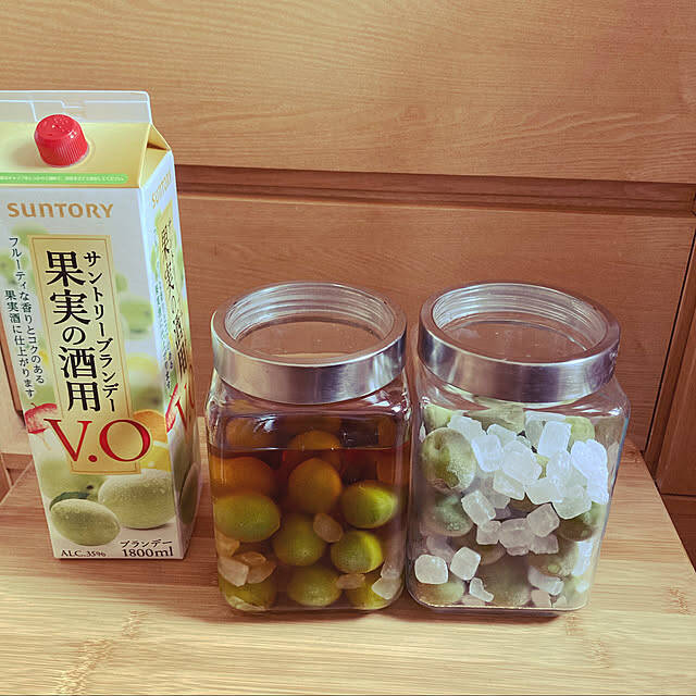 蓋から中身が見えるガラスキャニスターで梅酒をつくられているyammyさん。「四角い形だから冷蔵庫でもすっきり」とお気に入りの様子です。 ガラス製でアルコールや塩分にも強く、透明な蓋で上からも中身が見えるので、長期保存にぴったりですね!
