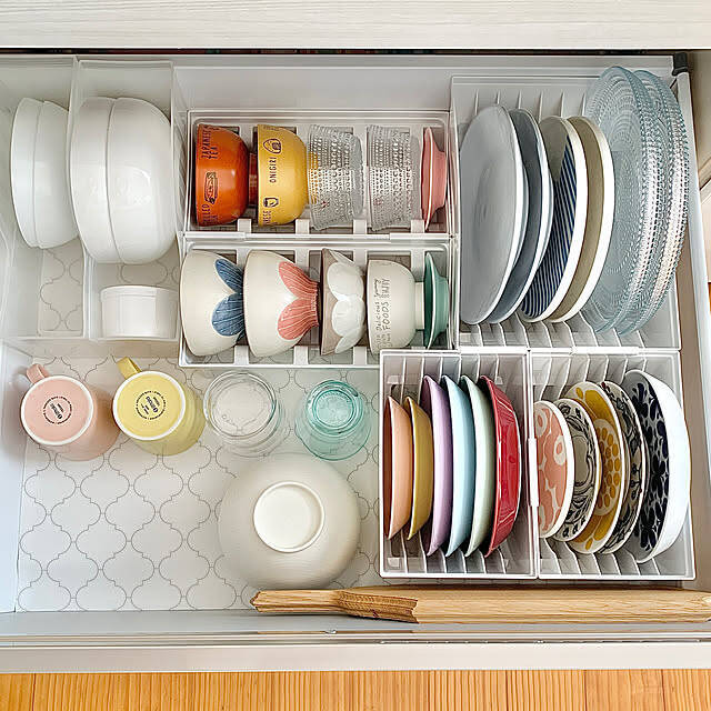 引き出しにトトノシリーズのお椀スタンドとディッシュスタンドを取り入れ、お皿を立てて収納しているkoko_hikaさん。重ねずに並べることで、見やすく取り出しやすい収納が叶いました。食器が安定して置けるようになり、使い勝手も抜群です。収納できる数も増えたそうですよ。