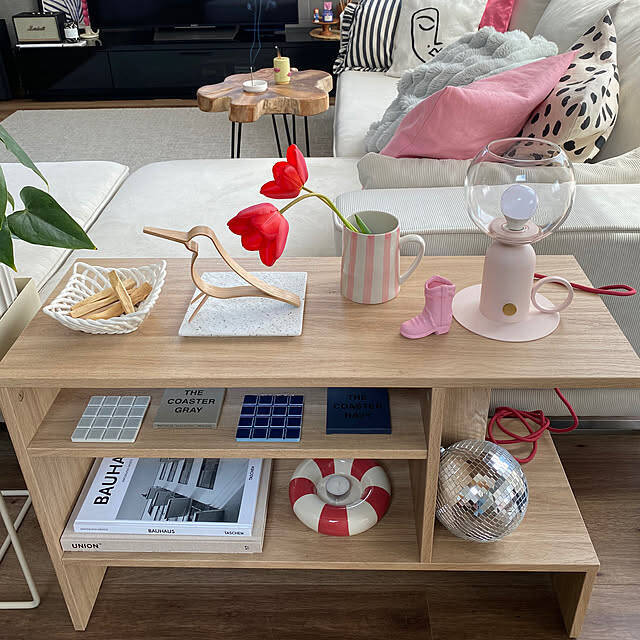 kahomeさんは、IKEAのホルメルドをソファサイドにコーディネートしていました。テーブルとしてはもちろん、収納が充実しているので、物の整理や飾り棚としても重宝しますよ。お気に入りの雑貨を使ったはなやかなディスプレイも素敵ですね。
