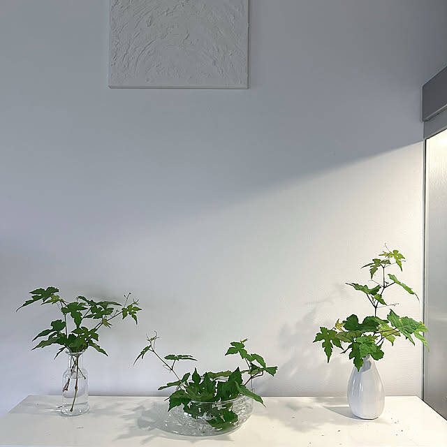 たくさん飾られたグリーンが鮮やかなhanahana1444さんのお部屋です。金魚鉢のように口の大きく開いたフラワーベースは、プラスチックとは思えない重厚感がありますね。背の低いフラワーベースなので、安定して飾ることができます。