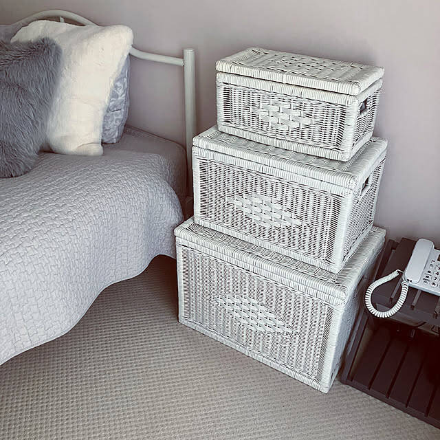 サイズ違いのボックスを3つ積み重ねているkazuさん。中には布団カバーや枕カバーを入れているそうです。ベッド横なので、交換の際、すぐに準備できますね♪置くだけで様になる、インテリア性の高さも魅力的です。