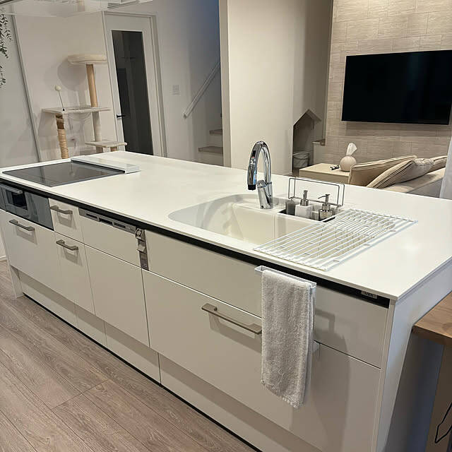 fu_さんのアイランドキッチンは、すっきりとシンプルな仕上がり。白で統一された物が少ない空間は、水まわりに相応しい清潔感にあふれていますね。厳選された物だけでコーディネートすれば、洗練された雰囲気が演出できますよ。