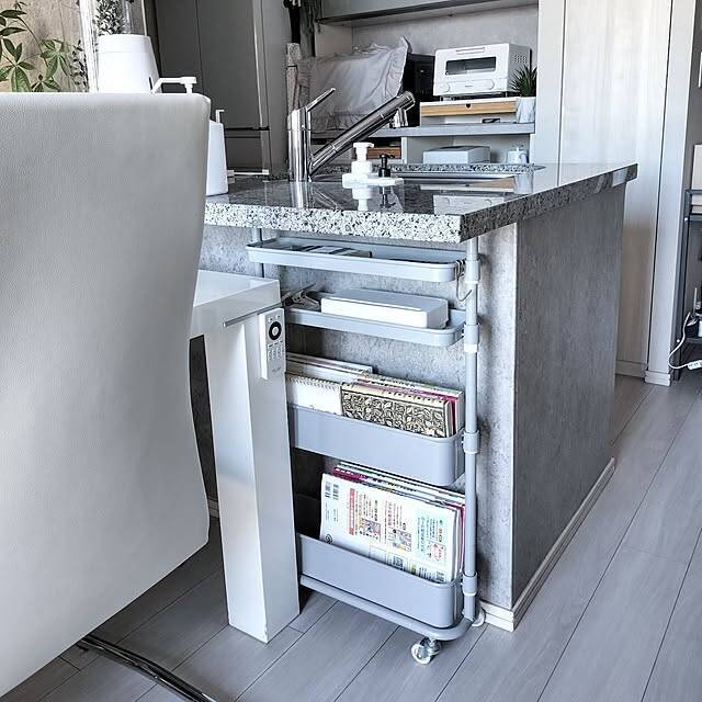 ダイニングテーブルとキッチンカウンターの間にできた16cmの隙間。ユーザーさんは、幅も高さもスペースにぴったりな、スリムなバスケットワゴンを置かれています。こちらにはお子さん用の勉強道具や、仕事用の本などを収納。キャスター付きなのでサッと出し入れでき、掃除もしやすいそうですよ。