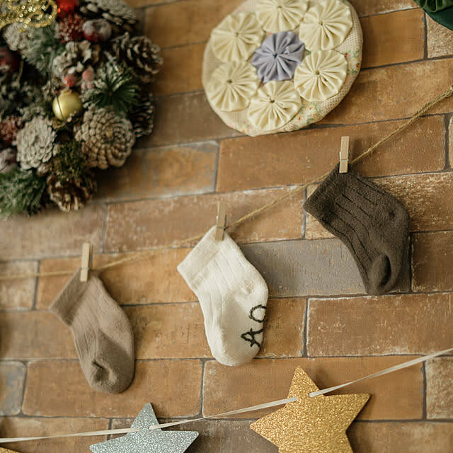 お子さんの初めての靴下をガーランドにしたeyes.homeさん。シックなカラーでサイズ感もちょうどよく、クリスマスの飾りにぴったりですね。小さい靴下だからこそ思い出になる、すてきなアイデアです!