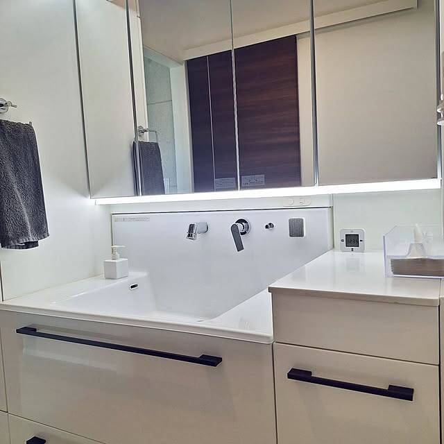 洗面台のまわりに、ほとんど物を置いていないユーザーさんです。出してあるのはソープや時計、ティッシュペーパーなど、最低限のものに絞られています。他はすべて鏡の中に収めているのだそうですよ。建具もホワイトで統一しておられ、清潔感いっぱいの洗面所ですね。