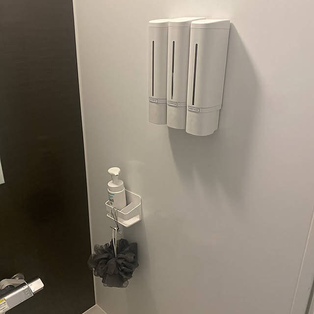 HelloKitchenさんが紹介してくれたのは、山崎実業のtower「マグネットディスペンサーホルダー」でボトルを浮かせて壁面に取り付ける方法です。自分が使いやすい位置に付けられ、床に置かないことで清潔に保ちやすくなります。ボトルが統一されているので、見た目にも整っていてきれいです。
